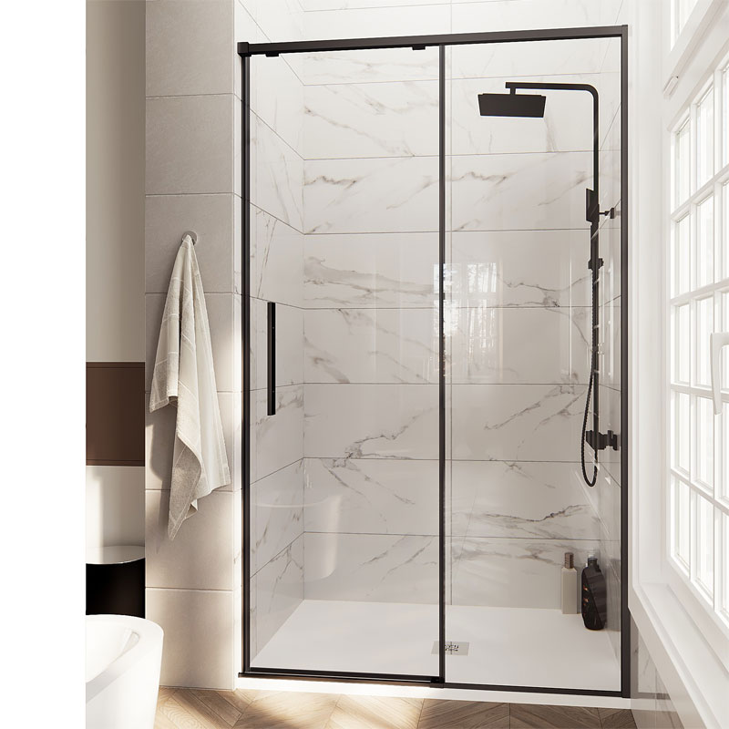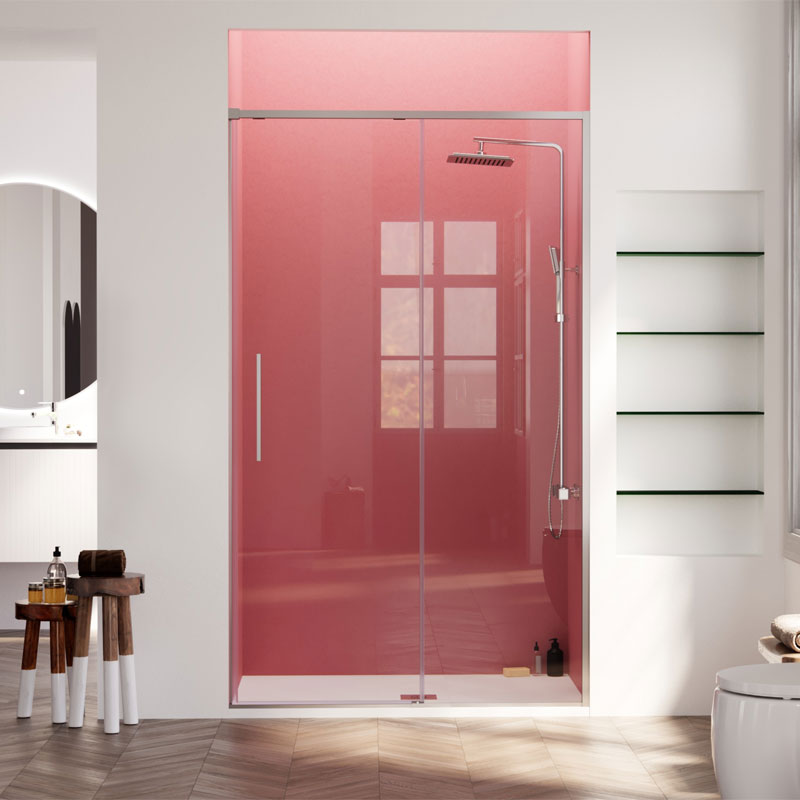 La mampara está compuesta por 1 fijo y 1 puerta correderas lateral por lo que nos proporcionará el acceso por uno de los dos lados. La puerta va provista de rodamientos que se deslizan suavemente por la guía superior.El diseño de la mampara hace que esta carezca de marco inferior por lo que se consigue eliminar completamente la presencia de rodamientos en la zona inferior, facilitando al máximo grado la facilidad en el mantenimiento y la limpieza así como la perdurabilidad del producto.