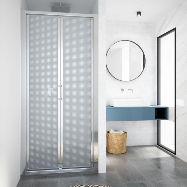 Mampara plegable de ducha en acrílico con sistema antipánico de seguridad.